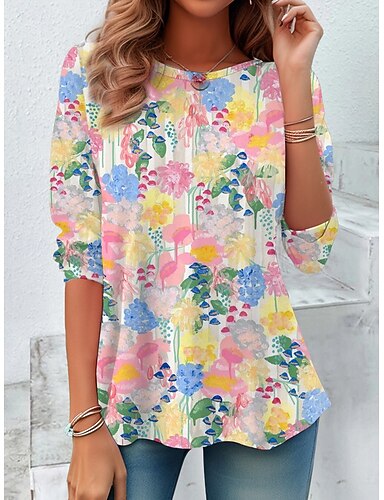 Dames T-shirt Crew Neck Lange Mouw Tuniek Bloem Grafisch Casual Reguliere Tops Dagelijkse Print Roze Lente Herfst