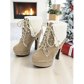 Rode laarzen met imitatiebontvoering en hoge hak voor dames – stijlvolle veterlaarzen met plateauzool voor de winter, kerstfeestjes en feestelijke gelegenheden
