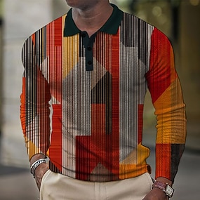 Voor heren Ruitjes Wafel Poloshirts Golfshirt Lange mouw Poloshirt Overhemden met kraag Vintage Casual Vakantiekleding Formele kleding Festivalkleding Knop 3D-afdrukken Lente Herfst Winter Oranje