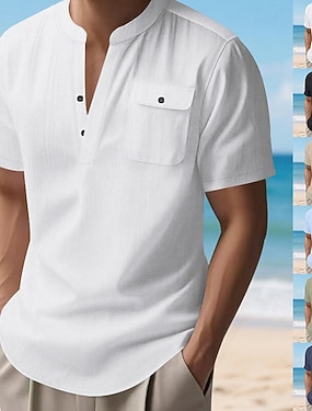 Voor heren Overhemd Linnen overhemd Zomer overhemd Strand Kleding Overhemd met bandkraag Overhemd met knopen Effen Vakantie Casual Zwart Wit Geel blauw Korte mouw Kraag Zomer Kleding