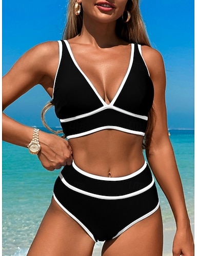 Dames Bikini 2-delige Badmode Kleurblok Cheeky Buikcontrole Hoge taille Slank Rugloos Vakantie Strandkleding Stripe V-hals Mouwloze Badpakken