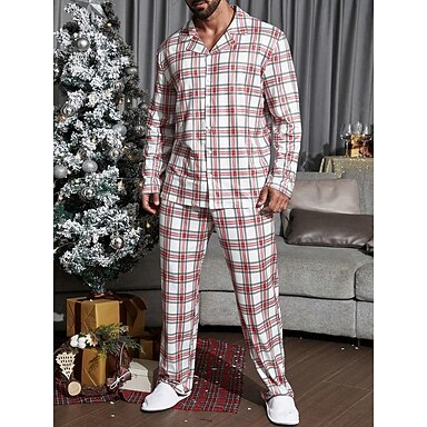 Voor heren Loungewear Nachtkleding Pyjamaset Pyjamatop en broek 2-delig Ruitjes Stijlvol Casual Comfortabel Huis Dagelijks Bed Katoenmix Comfort Zacht Revers Lange mouw Overhemd Pantalon Trekkoord