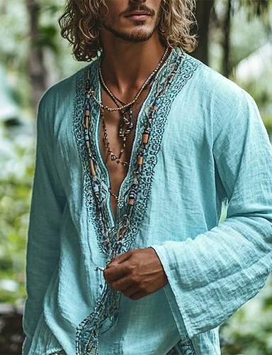 Voor heren Overhemd linnen overhemd Popover-shirt Zomer overhemd Strand Kleding Effen Vakantie Feestdagen Hemelsblauw Lange mouw Diepe V-hals Zomer Lente Kleding Etnisch & Religieus