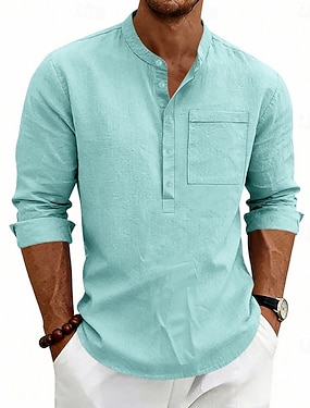 Voor heren Overhemd Linnen overhemd Popover-shirt Zomer overhemd Strand hemd Effen Casual Vakantie Zwart Wit Blozend Roze Khaki Lange mouw Band Kraag Zomer Lente Kleding Zak