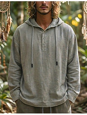Voor heren Overhemd Linnen overhemd Popover-shirt Zomer overhemd Strand Kleding Overhemd met capuchon Effen Casual Vakantie Grijs Lange mouw Capuchon Zomer Lente Kleding