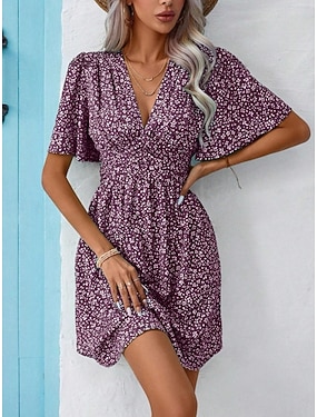 Dames Mini-jurk A lijn jurk Casual Buiten Uitgaan Standaard pasvorm Bloemig Korte mouw V-hals Zwart Blozend Roze blauw Paars Zomer