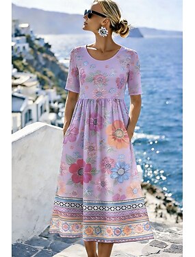 Dames Halflange jurk Casual jurk Zomerjurk Vakantie Casual Strandstijl Feestdagen Normale pasvorm Bloemig Grafisch Korte mouw Strakke ronde hals blauw Blozend Roze Paars Groen Zomer Lente