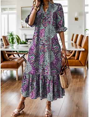 dames lange jurk maxi-jurk boho-jurk casual jurk swingjurk zomerjurk vintage vakantie dagelijks strand normale pasvorm bloemen lange mouw v-hals paars zomer lente herfst