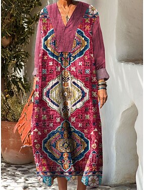 Dames Maxi-jurk Boho-jurk Vintage Jurk Casual jurk Vintage Dagelijks Buiten Vakantie Ruim Passend Geometrisch Lange mouw V-hals blauw Paars Fuchsia Groen Lente Herfst