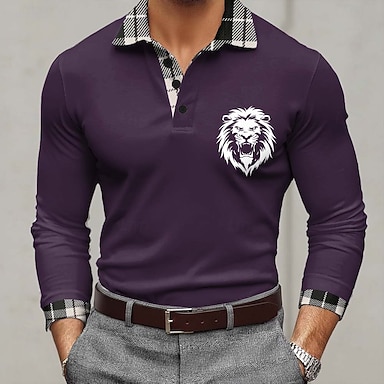 Voor heren Leeuw Polo Lange mouw Poloshirt Revers Casual Buiten Straat Sportkleding Alledaagse kleding 3D-afdrukken Knop Lente Herfst blauw Zwart Rood