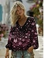 Dames T-shirt Henley-shirt Knop Afdrukken Bloemig Wijnoogst Etnisch Dagelijks Basic 3/4 mouw V-hals Normale tops Feestdagen Weekend Rood Paars Groen Khaki Grijs Herfst winter