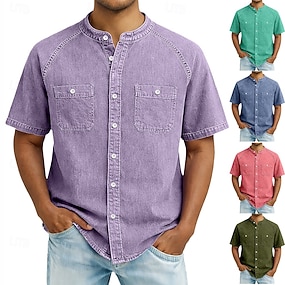 Voor heren Overhemd Normaal shirt Overhemd met knopen Overhemd van 100% katoen met zure wassing Zwart Lichtgroen Blozend Roze Paars khaki Korte mouw Effen opa kraag Casual Dagelijks Voorvak Kleding