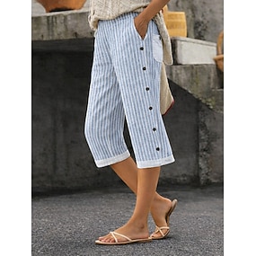Dames Katoen Capri broeken Katoenmengeling Imitatie katoenlinnen Vakantie Modieus Streetwear Knielengte Hoge taille Gestreept Trekkoord Zak Elastische taille Ademend Comfortabel Inelastisch Dagelijks