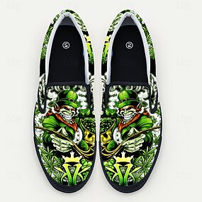 Groene instapschoenen voor heren met bloemenprint – uniek ontwerp met doodskop en klavertje, comfortabel en stijlvol schoeisel voor St. Patrick's Day en andere feestelijke gelegenheden.