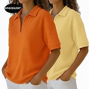 Multipacks van 2 stuks dames wafel T-shirt polo shirts wafelgebreide tops effen modieus basic klassiek shirt met korte mouwen kraag normale tops casual dagelijks strand geel+oranje