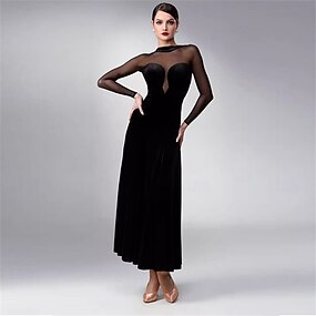 dames ballroom dansjurk fluwelen mesh lange mouwen wals tango latin wedstrijdvoorstelling jurk elegant zwart