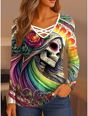 Dames T-shirt Schedels Grafisch Vintage Stijlvol Klassiek Lange Mouw V-hals Reguliere Tops Dagelijks Uitsnede Print Roze Blauw Oranje Grijs Lente Fall