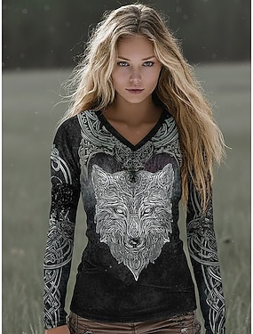 Vrouwen Boho Viking T Shirt Graphic Dier Vintage Stijlvol Klassiek Lange Mouwen V-Hals Reguliere Tops Dagelijkse Weekend Print Zwart Zomer Lente
