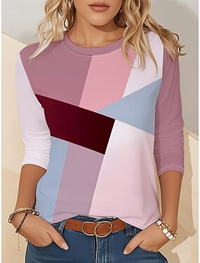 Dames T-shirt Afdrukken Grafisch Geometrisch Modieus Casual Lange mouw Strakke ronde hals Normale tops Dagelijks blauw Blozend Roze Rood Licht Bruin Zomer Lente Herfst Winter