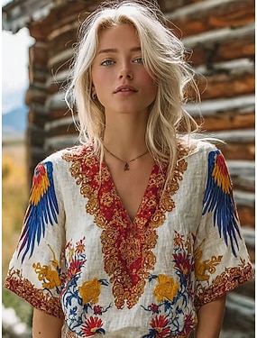 Vrouwen Linnenachtige Faux Katoen Linnen Boho T-shirt Bloemig Grafisch Vintage Stijlvol Klassiek Korte Mouw V-hals Reguliere Tops Dagelijkse Weekend Vakantie Wear Print Rood Oranje Zomer Lente