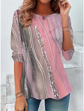 Dames T-shirt Kraag Lange Mouw Tuniek Graphic Geometrisch Gestreept Vintage Stijlvol Ronde Hals Reguliere Tops Dagelijkse Print Wit Roze Blauw Paars Herfst