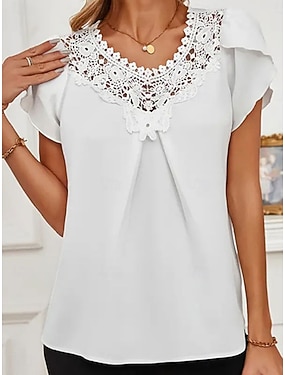 Dames T-shirt Kant Lapwerk Effen Modieus Stijlvol Klassiek Korte mouw Strakke ronde hals Normale tops Dagelijks Uitgaan Weekend Wit Zomer Lente