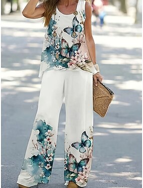 Dames Broeken Sets Mouwloos Ronde hals U-hals Bloemig Grafisch Vlinder Vakantie Dagelijks Casual Dagelijks Licht Blauw Zomer Ruim Passend