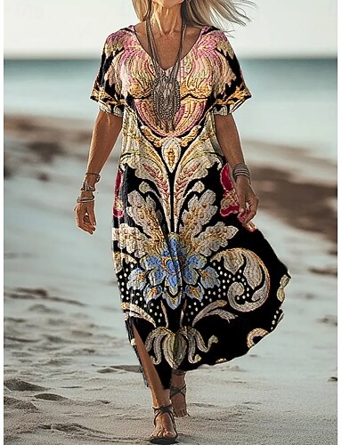 Dames Maxi-jurk Zonnejurk T shirt jurk A lijn jurk Vakantie Casual Strand Uitgaan Normale pasvorm Grafisch Tribal Korte mouw V-hals Zwart Rood Kameel Zomer Lente