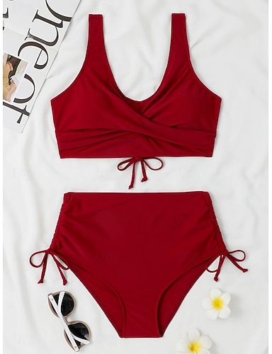 Dames Zwemkleding Bikini 2 stuks Hoge taille Zwempak Met ruches Blote rug Vakantie Strand Kleding Effen V-hals Mouwloos Badpakken