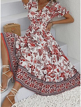 Pasen Dames Maxi-jurk A lijn jurk Casual Dagelijks Normale pasvorm Bloemig Abstract Korte mouw V-hals Wit Rood Bruin Zomer Lente