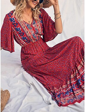 Dames Maxi-jurk Zonnejurk strand jurk A lijn jurk Bloemetjesjurk Casual Dagelijks Normale pasvorm Bloemig 3/4 mouw V-hals Wit Champagne Rood Lente Herfst