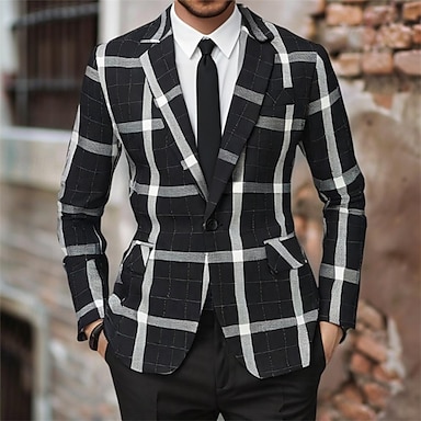 Voor heren Afstuderen Blazer liiketoiminta Cocktailparty Bruiloft Modieus Casual Lente Herfst Polyester Ruitjes Zak Knop Comfortabel Enkele rij knopen Blazer Zwart Bruin Koffie Grijs