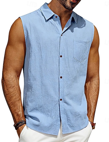 Voor heren Overhemd Linnen overhemd Zomer overhemd Strand Kleding Mouwloos shirt Effen Kleur Casual Vakantie blauw Zwart Wit Geel Mouwloos Strijkijzer Zomer Lente Kleding Zak