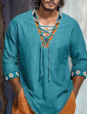 Voor heren Overhemd Linnen overhemd Popover-shirt Zomer overhemd Strand hemd Vintage overhemd Effen Vakantie Casual blauw Lange mouw V-hals Zomer Lente Kleding
