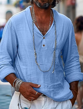 Voor heren Overhemd linnen overhemd Popover-shirt Zomer overhemd Strand Kleding Effen Casual Dagelijks Zwart Wit Licht Blauw Lange mouw Kraag Lente zomer Kleding