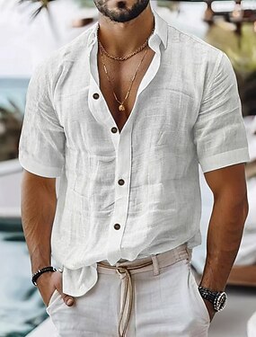 Voor heren Overhemd linnen overhemd Zomer overhemd Strand hemd Effen Kleur Vakantie Curise Zwart Wit Grijs Licht Blauw Korte mouw Omgeslagen kraag Lente zomer Kleding Zak