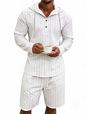 Voor heren Linnen overhemd 2-delig Popover-shirt En Korte broek Linnen korte broek Strandshorts Set Verticale stroken Dagelijks Buiten Vakantie Capuchon Lange mouw Zomer Lente Modieus Casual