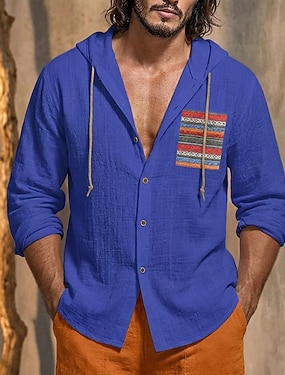 Voor heren Overhemd Linnen overhemd Zomer overhemd Strand hemd Overhemd met knopen Overhemd met capuchon Boho Casual Vakantie Koningsblauw Lange mouw Capuchon Zomer Lente Kleding Lapwerk