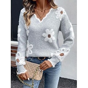Dames Trui Elegant Vintage leuke Style Bloemig Kabel V-hals Bloemig Lange mouw Normale tops breien School Buiten Huis blauw Bruin Lente Herfst