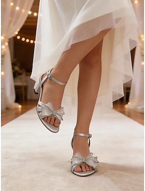 Bruidssandalen van zilverkleurig satijn met kittenhak en strik van strasssteentjes – elegante open teenschoenen met enkelbandje voor de bruid en het bruidspaar.