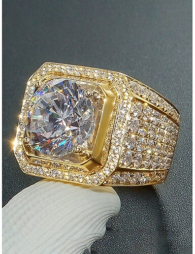 Herenring van verguld/verzilverd legering met grote vierkante zirkonia, bezet met kleine diamanten, perfect voor Valentijnsdag, bruiloften en als cadeau.