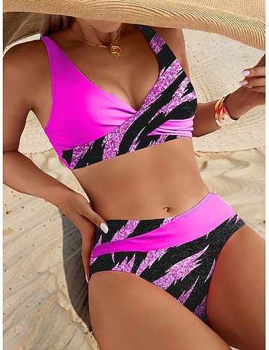 Dames Bikini 2-delige Badmode Kleurblok Cheeky Buikcontrole Hoge taille Slank Rugloos Vakantie Strandkleding Stripe V-hals Mouwloze Badpakken