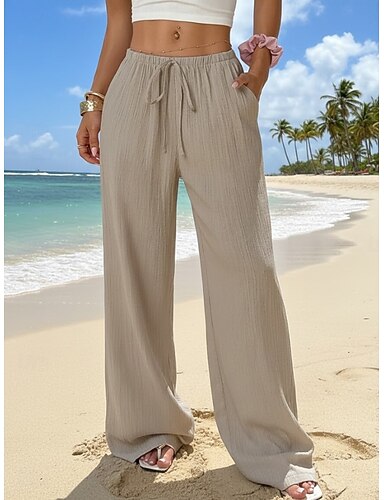 Dames Broek Zomerbroek Wijde broek Strandbroeken Vakantie Basic Volledige lengte Medium Taille Effen Kleur Effen Trekkoord Recht been Comfort Zacht Ademend Inelastisch Dagelijks Strand Feestdagen