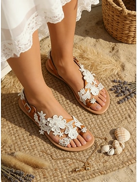 Witte strandhuwelijkssandalen met bloemenkant voor dames - perfect voor zomerbruiloften en informele uitstapjes