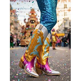 Vrouwen's Mardi Gras Multikleuren Lederen Blokhak Laarzen met Golvend Ontwerp Comfortabel en Vibrant Ideaal voor Carnaval en Feestelijke Gelegenheden