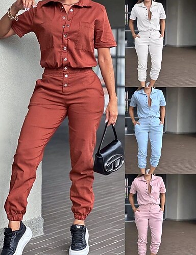 Dames Jumpsuit Actief Effen Kleur Korte mouw Cargohosen Overhemdkraag Zak Knop Vakantie Dagelijks Normale pasvorm Wit Blozend Roze Wijn Zomer
