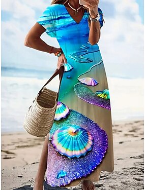Dames Maxi-jurk Zonnejurk T shirt jurk A lijn jurk Vakantie Casual Strand Uitgaan Standaard pasvorm Bloemig Grafisch Korte mouw V-hals blauw Blozend Roze Grijs Zomer Lente