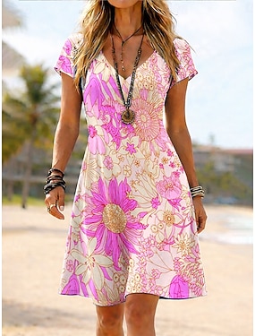 Dames Knielengte jurk Zonnejurk T shirt jurk A lijn jurk Vakantie Casual Boho Strand Normale pasvorm Bloemig Grafisch Korte mouw V-hals blauw Blozend Roze Rood Groen Zomer Lente