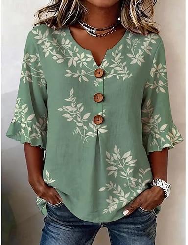 Dames T-shirt Afdrukken Bloemig Grafisch Planten Stijlvol Klassiek Casual Korte mouw V-hals Normale tops Dagelijks blauw Blozend Roze Groen Zomer Lente