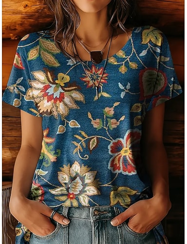 Dames T-shirt Afdrukken Bloemig Grafisch Planten Vintage Stijlvol Klassiek Korte mouw Strakke ronde hals Normale tops Dagelijks blauw Geel Licht Blauw Zomer